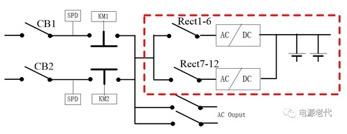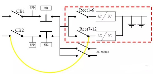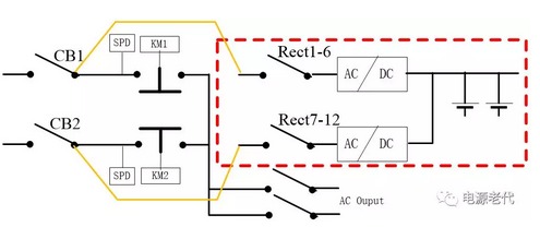 | 在處理完一次鐵路電源系統(tǒng)ATS故障后,曾向鐵路系統(tǒng)維護人員提出這樣一個優(yōu)化方案:電源適配器整流模塊全實時在線,更是大大提高系統(tǒng)可靠性! 改造前原系統(tǒng)方案如下: ![]() 圖5.1 電源適配器CC級ATS組成系統(tǒng)示意圖 圖5.1為艾默生網(wǎng)絡能源有限公司PS48600-3/2900-X4系統(tǒng)示意圖,可看出:電源適配器輸入兩路交流市電經(jīng)CC級ATS后到交流母線,交流有幾個支路帶交流負載,其余主要是給直流系統(tǒng)用(如紅色框中部分); 直流系統(tǒng)是整個電源的核心,需要優(yōu)先保證其可靠性;而直流系統(tǒng)的交流輸入經(jīng)與ATS串聯(lián)后,可靠性大大下降。 5.2 改造后系統(tǒng)方案如下: 5.2.1 兩路市電經(jīng)原電源適配器系統(tǒng)主空氣開關CB1、CB2后仍接ATS; 5.2.2 艾默生防雷接在ATS前端,且每路市電配一個,所以防雷部分利舊; 5.2.3 原ATS輸出到整流模塊輸入空開匯流排的線&整流模塊輸入空開匯流排拆除; 5.2.4在ATS上端子或CB1輸出端子分別引輸入電纜,直接連到各整流模塊輸入空氣開關; 5.2.5 改造后,只要市電1、市電2任一路有電或都有電,直流母排始終有電,無任何切換,重要的部分可靠性大大提高! 改造后的系統(tǒng),因兩路完全在線,對電池要求可降低; 改造后,ATS觸點不走大電流,ATS自身故障率將降低,也提高交流負載供電可靠性! ![]() 圖5.2 改造后系統(tǒng)原理示意圖 電源適配器改造方案說明(只是說明工作量和原理) 圖5.3 改造示意圖 保證電源適配器模塊1-6和7-12位置均有相近數(shù)量的模塊;因兩路市電一路優(yōu)先,因此一般是市電一工作;斷開CB2及CB2上級空氣開關,斷開Rect7-12模塊輸入空氣開關(依據(jù)負載功率,可以是兩只或三只甚至更多),接圖5.3中黃線所示位置接線;接好線后繼續(xù)保持Rect7-12空氣開關斷開(改線的幾個都保持斷開); 電源適配器送CB2上級交流電、維持CB2、Rect2空開斷開狀態(tài):此時,不管ATS狀態(tài),只要交流2有電,負載就一直正常; 5.3.3 斷開CB1及上級空氣開關,接圖5.3.3綠色線示意,接模塊1-6電纜; ![]() 圖5.3.3電源適配器接線過程 在5.3.3電源適配器部分接線完成,合CB1及上級空開,此時模塊1—6工作將正常,此時系統(tǒng)結構將如5.3.4所示; 5.3.4 接線過程 5.3.5 將CB2及上級空開斷開,同理接Rect7-12模塊空開至CB2下端子線,接好后如圖5.3.5所示,送CB2及上級空開,模塊7-12將正常工作; 圖5.3.5 接線完成后 5.3.6 至此,改造順利完成; 文章轉載自網(wǎng)絡,如有侵權,請聯(lián)系刪除。 |