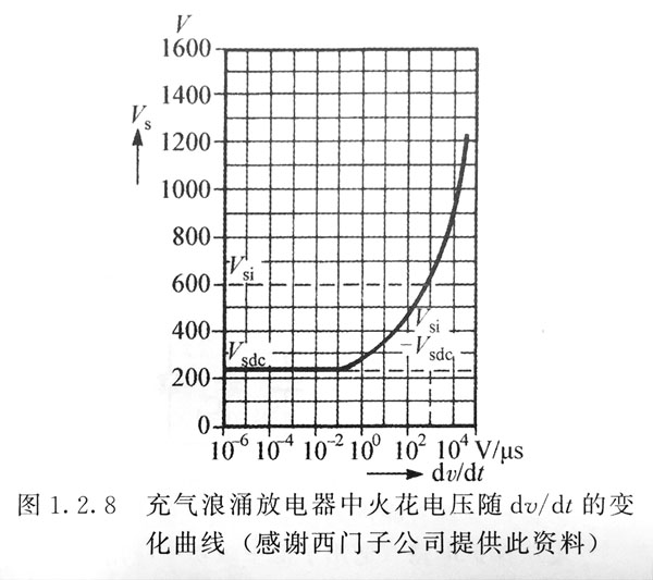 充氣浪涌放電器的一個缺點是其對過壓應(yīng)力的反應(yīng)速度相對慢。等離子體的形成過程是相當(dāng)慢的,而起弧電壓與dv/dt有關(guān)。如圖1.2.8所示,一個典型的270V裝置中起弧電壓是dv/dt的函數(shù),這種效應(yīng)在瞬變尖峰沖擊速率為10V/us時是非常明顯的,因此,對快速瞬變過程來說,充氣浪涌放電器必須有濾波器或快速反應(yīng)的鉗位裝置的支持。