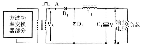 該圖表示了輸出LC濾波器和整流器(正如在典型的單端正激變換器副邊見到的樣)。對于這種濾波器結構,輸出電壓與變壓器副邊電壓的關系由下式表示: