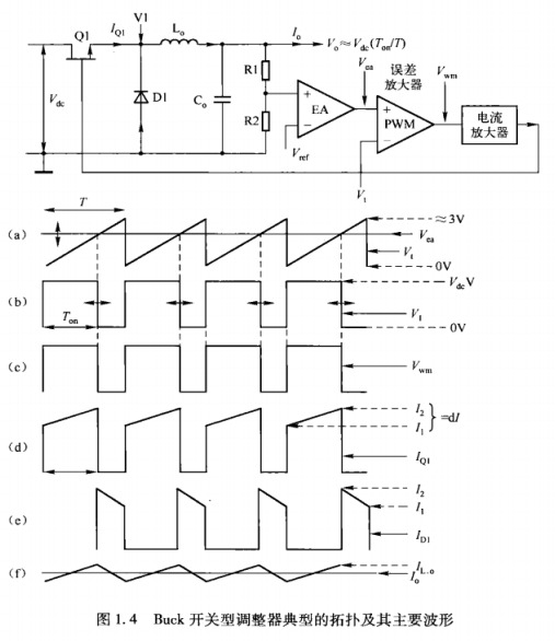 Buck開關型調整器 串接晶體管的高功耗和笨重的工頻變壓器使得線性調整器在現代電子應用中失去了重要地位。而且,高功耗串接元件需要的大散熱片和大體積儲能電容增大了線性調整器的體積。隨著電子技術的發展,電路的集成化使得電路系統的體積更小。一般的線性調整器輸出負載的功率密度僅為0.2~0.3W/in3,不能滿足電路系統小型化的要求。而且,線性電源適配器不能夠提供數字存儲系統所需要的足夠長的保持時間。 取代線性調整器的開關型調整器早在20世紀60年代就開始應用。一般的,這些新的15W電源適配器使用開關晶體管將輸入直流電壓斬波成方波。方波由占空比調節,并通過低通輸出功率濾波得到直流輸出電壓。 濾波器一般采用電感和輸出電容。通過調節占空比,可以控制經過輸出電容濾波的電壓平均值。方波脈沖經過低通濾波器濾波后得到的直流輸出電壓等于方波脈沖的平均值Buck開關型調整器典型的拓撲及其波形如圖所示。 使用合適的LC濾波器可將方波脈沖平滑成無紋波直流輸出,其值等于方波脈沖的平均值。整個電路采用輸出負反饋,通過檢測輸出電壓并結合負反饋控制占空比,穩定輸出電壓不受輸入網壓和負載變化的影響。 目前高頻開關電源適配器的功率密度可達20W/in3,而且可以獲得與輸入隔離的多組輸出。它們無需工頻變壓器,效率達到75%~95%。有些DC/DC變換器功率密度可高達50w/in3 Buck調整器的基本符號和波形 補充: 電源適配器廠家介紹了以下開關型調整器的恒頻工作方式,在這類調整器中,功率器件的導通時間(Ton)是可調的,而整個開關周期(T)是固定的,即開關頻率(1/T)也是固定的。 比例Ton/T一般稱為占空比。在某些書中,占空比用Ton/(Ton+Toff)表示,其中Toff是功率器件的關斷時間,因此Ton+Toff=T。 除了恒頻工作方式,還有導通時間固定而頻率可調的工作方式,或者導通時間和頻率均可調的工作方式。 dl、di、dV、dv、dT和dt的用法不是很嚴格,一般用來表示△l、△V和△的變化量。例如,△∥△t用導數d/dt表述,表示電流相對時間的變化量或波形的斜率。 12w電源適配器Buck調整器的基本工作方式 Buck調整器的基本電路如圖1。4所示。晶體管Q1與直流輸入電壓V串聯,通過Q1硬開通和硬關斷,在V1處產生方波電壓。采用恒頻控制方式,占空比可調,Q1導通時間為T。Q1導通時,V1點電壓為V(設Q1導通,壓降為零),電流通過串接電感L流入輸出端。Q1關斷時,電感L產生反電動勢,使V1點電壓迅速下降到零,并變負值直至被二極管D1(也稱續流二極管)鉗位于-0.8V。 設此刻二極管D壓降也為零,則V點電壓波形為矩形波,如圖所示,T時段電壓為V,其余時段電壓為零。該方波的電壓平均值為V7/7。LC濾波器接于Ⅵ和V之間,它使輸出點V成為幅值等于V7。/7的無尖峰無紋波的直流電壓。 采樣電阻R和R2檢測輸出電壓V,并將其輸入誤差放大器(EA)與參考電壓V進行比較。被放大的誤差電壓V被輸入到脈寬調制器(電壓比較器)PWM。PWM比較器的另一個輸入是周期為T的鋸齒波,如圖所示,其幅值一般為3V。PWM電壓比較器產生矩形波脈沖,即圖(c)中的V=,它從鋸齒波起點開始到鋸齒波與誤差放大器輸出電壓交點結束。因此,PwM輸出的脈沖寬度T=與誤差放大器輸出電壓成比例。 PWM脈沖輸入到電流放大器并以負反饋方式控制開關管Q1的通斷。其邏輯關系是:若輸入電壓V稍升高,則EA輸出電壓V將降低使鋸齒波與V交點提前,Q1導通時間T??s短使輸出電壓V0=VdcTon/T保持不變。同理,若V下降,則導通時間7正比的延長使保持不變。Q1導通時間的改變使采樣電壓總是等于參考電壓,即V0R2/(R2+R1)=Vref。 ![]()