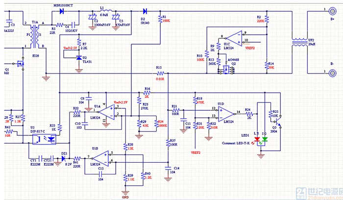 R29 43K和R34 1800K,并聯起來約為42K,則恒壓 LM324的2腳電壓8.4/(100+42)*42=2.48V,與LM324的3腳2.5V比較