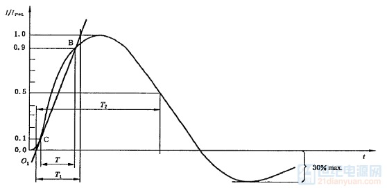 8/20us短路電流波,8us是波形的上升時間,20us是半峰值時間,具體定義同上,將設備的輸出端短路,測試短路電流就是這樣的波形。