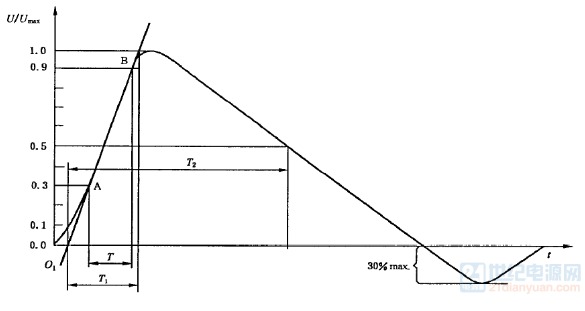 1.2/50us開路電壓波,1.2us是波形的上升時間,具體指波形從10%上升到90%所用的時間,50us是半峰值時間,具體指波形上升至50%到波形下降至50%的時間,用示波器測量設備的開路波形就是這樣的。