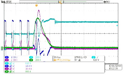 圖1浪涌測試 紫色MOSFET IDS 黃色是VDS                        圖2浪涌測試 紫色VDS電壓 ,藍色是IDS