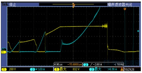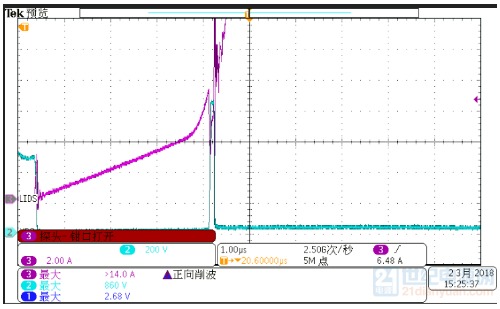 黃色線是MOSFETVDS電壓,藍色是IDS