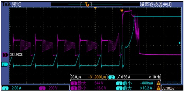 其中Von=Vin,D為占空比,r=0.3-0.5,fsw指開關頻率,IL是電感電流。Von一般較大277Vac或者300Vac,但是在浪涌脈沖測試時,由于母線電壓突然升高,超過設計輸入電壓較高值1.2倍或者更多,變壓器電感會迅速出現飽和。下圖1中紫色電流在開關周期后階段出現飽和跡象,MOSFET電流應力迅速上升達到7.32A。在正常開關周期,MOSFET IDS=3A。器件在高電流、高電壓應力發生雪崩,MOSFET失效,表現為短路,引起開關電源適配器輸入端保險絲,整流橋和驅動IC失效。
