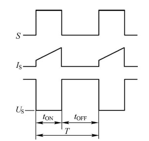 通過提高開關頻率,濾波電感、開關變壓器等磁性器件,以及濾波電容等都可以小型輕量化。對于DC-DC轉換器,加在開關S兩端電壓US的波形近似為方波,而通過電流IS的波形近似為三角波或有臺階的三角波,如圖所示。其占空比定義