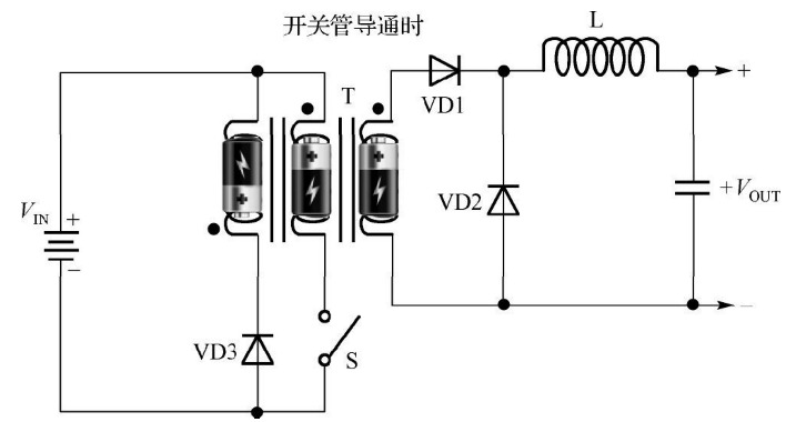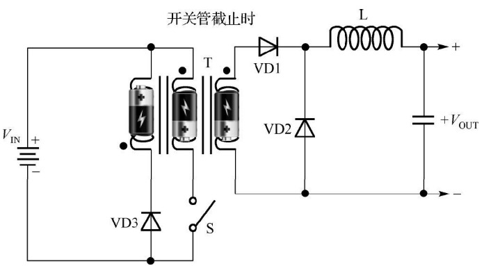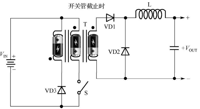 VD3所連的電感在能量從電源到變壓器的傳遞過程中是截止的。這意味著在開關管導通時,這個電感的確與能量從電源到負載的傳遞過程無關。