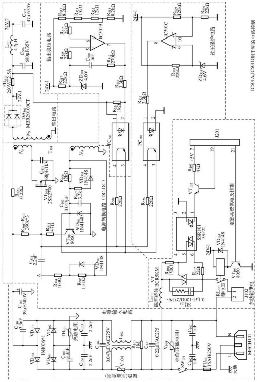 目前許多打印機(jī)使用自激式電源適配器,根據(jù)功能和打印方式的不同,打印機(jī)可分為針式打印機(jī)、票據(jù)打印機(jī)、噴墨打印機(jī)、激光打印機(jī)等多種。圖3-33為惠普HP1018激光打印機(jī)電源適配器原理圖,主要由市電交流輸入及轉(zhuǎn)換、定影系統(tǒng)供電、主電源適配器等電路構(gòu)成。各部分電路工作原理如下。![]() 1.市電輸入及轉(zhuǎn)換 電源適配器輸入電路是指高頻干擾抑制、整流和濾波電路。其作用是把電網(wǎng)的工頻交流電轉(zhuǎn)換為平滑的直流電,給電源適配器提供輸入電壓,并抑制和濾除輸入端的高頻雙向干擾。有關(guān)輸入電路各元器件的作用可參見第2章中的表2-3。 2.定影系統(tǒng)供電及控制 通電后,打印機(jī)CPU經(jīng)由接插件J201的19、21腳送入高電平,因J201的7腳為+5V(來自于主控板),VT102與VT103均導(dǎo)通。其中,VT102導(dǎo)通,經(jīng)光耦SSR101(3SF21)給雙向可控硅VT101(BCR5KM)提供觸發(fā)信號使其導(dǎo)通;VT103導(dǎo)通,繼電器RL101觸點(diǎn)吸合,此時市電通過接插件J101為陶瓷片供電加熱。當(dāng)加熱陶瓷片的溫度達(dá)到185℃左右時,接插件J201的19腳變?yōu)榈碗娖剑琕T102截止,VT101關(guān)斷,陶瓷片加熱停止,與此同時,微處理器發(fā)出指令使“準(zhǔn)備好”燈點(diǎn)亮。 另外,該機(jī)具有節(jié)能功能。如果在設(shè)定時間內(nèi)打印機(jī)仍未工作,則接插件J201的21腳變?yōu)榈碗娖剑琕T103截止,繼電器RL101觸點(diǎn)釋放,機(jī)器進(jìn)入待機(jī)狀態(tài)。二極管VD105反并聯(lián)于繼電器RL101供電線圈兩端,在VT103截止時吸收線圈瞬間感應(yīng)電壓,對VT103起保護(hù)作用。 雙向可控硅VT101主回路兩端并聯(lián)的SQ101是一個阻容串聯(lián)復(fù)合體,復(fù)合體電阻為120Ω,電容為0.1μF/AC275V。在可控硅關(guān)斷瞬間,阻容復(fù)合體吸收感性負(fù)載的瞬變高壓(也可以理解為“剩余能量”)保護(hù)可控硅。這種阻容復(fù)合體吸收電路在交流市電的可控硅供電系統(tǒng)中已經(jīng)成為必選。 3.主電源 該機(jī)是由功率管VT501(2SK2700是MOSFET)和開關(guān)變壓器T501為核心構(gòu)成的自激式電源適配器。 (1)開關(guān)管VT501的開關(guān)過程 輸入整流濾波電壓約為300V:一路經(jīng)保險電阻R523(0.22Ω)、T501主繞組NP加到開關(guān)管漏極(D);另一路經(jīng)R501~R503給VT501提供啟動電壓。輔助繞組NA經(jīng)阻容元件與開關(guān)管VT501組成振蕩電路,VT501是開關(guān)管兼振蕩管。高壓電容C501(680pF/1kV)并聯(lián)在VT501的漏—源極之間,用于抑制VT501關(guān)斷瞬間NP產(chǎn)生的浪涌電壓。 VT501導(dǎo)通時,NA同名端(黑圓圈)為正極性電壓:一方面經(jīng)R504、R505和C502送到功率管柵極加速其導(dǎo)通;另一方面經(jīng)R506給C503充電,C503兩端電壓約為0.6V時VT502開始導(dǎo)通,并聯(lián)于VT502發(fā)射結(jié)的電容C503兩端正電壓被鉗位。由于C503充電時間常數(shù)較大,故在VT501導(dǎo)通一段時間后VT502才導(dǎo)通,降低VT501柵極與源極之間的電壓,VT501漏極電流減小,變壓器所有繞組電壓極性反轉(zhuǎn)。NA同名端負(fù)極性的電壓一路經(jīng)R504、VD502和C502(VD502旁路R505)加到VT501柵極加速其截止;另一路經(jīng)R507和VD503給C503放電(R506阻值較大,被R507和VD503旁路),促使VT502退出導(dǎo)通,轉(zhuǎn)為截止。繼續(xù)放電約為-0.6V時VD501開始導(dǎo)通,此時電容C503兩端負(fù)電壓被VD501鉗位。 圖為某負(fù)載時以A點(diǎn)為參考零電位時測得的功率管柵極(G)電壓波形。可見,柵極電位(G)始終高于A點(diǎn)電位,振幅約為1.6V。 ![]() 由上述分析可知,VT501柵極通路電容C502充、放電的通路不同,VT502發(fā)射結(jié)并聯(lián)電容C503充、放電的通路也不同,它們均是充電時間常數(shù)大、充電慢,放電時間常數(shù)小、放電快。C502的充電時間設(shè)定了開關(guān)管VT501導(dǎo)通的較大脈沖寬度,在此脈寬之內(nèi)受控于脈寬調(diào)制管VT502;其充電慢、放電快有利于VT501快速截止。C503充電慢是為了滿足VT501具有較大導(dǎo)通脈沖寬度,放電快是便于進(jìn)入下一個控制周期。 (2)穩(wěn)壓控制 整流管DA501是共陰極(肖特基)二極管,F(xiàn)U501是延時型可恢復(fù)保險絲(防止輸出短路)。整流后的脈動電壓經(jīng)由C506、L101和C507組成的π形濾波器變成紋波很小的直流電。 穩(wěn)壓電路受光耦PC501和集成運(yùn)放IC501B控制。R517與ZD501產(chǎn)生4.6V基準(zhǔn)電壓,經(jīng)R525加到IC501B反相端(5腳),輸出電壓經(jīng)R513、R521、R522(9)和R514串聯(lián)產(chǎn)生采樣電壓,經(jīng)R515加到IC501B同相端(6腳)。由于某種原因?qū)е螺敵鲭妷荷撸瑒tIC501B同相端(6腳)電壓升高,輸出端(7腳)電壓隨之降低,光耦PC501光電二極管發(fā)光增強(qiáng)(導(dǎo)通電壓約為1V),光電晶體管的等效電阻減小。此時,VT501柵極正脈沖電壓經(jīng)R508、PC501對C503充電速度加快,VT502提前導(dǎo)通,VT501提前截止,占空比變小,輸出的電壓隨之下降,從而實(shí)現(xiàn)穩(wěn)壓控制。由于某種原因?qū)е庐?dāng)輸出電壓升高,有關(guān)節(jié)點(diǎn)電壓的變化趨勢如圖3-35所示中的①~⑥,即輸出電壓意外上升后,經(jīng)一系列反饋,后面導(dǎo)致占空比減小,從而保持輸出電壓穩(wěn)定。 ![]() 由上述工作原理分析,則輸出電壓UO為 ![]() 式中,4.6V為穩(wěn)壓二極管ZD501的參數(shù)。代入原理圖中有關(guān)