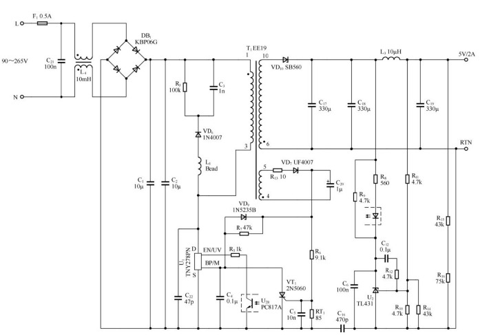 | 本文所討論的低功率電源適配器主要針對輸出功率10瓦的音頻產(chǎn)品充電適配器系統(tǒng)。此適配器設(shè)計特點 圖所示電路適用于通用輸入電壓范圍,具有極高的效率,符合適配器CEC能源之星對帶載效率的要求(要求為70.7%,可達到72.5%),空載時低輸入功率(在交流輸入電壓為230V時低于200mW);具有充足的EMI裕量,符合CISPR-22/EN55022B的EMI限制,EMI裕量大于10dBmV;具有增強保護、過壓鎖存保護(OVP)以及過熱鎖存保護(OTP)功能。 2.適配器工作原理 圖所示的反激式電源適配器使用了TNY278PN(U1),在90~265V交流輸入電壓下的輸出為5V/2A。選擇光耦構(gòu)成反饋回路,以實現(xiàn)準確、嚴格的輸出穩(wěn)壓。反饋信號饋入U1的EN/UV引腳。U1通過開關(guān)控制來調(diào)節(jié)使能與禁止開關(guān)周期的比率,從而達到調(diào)節(jié)輸出電壓的目的,使變換器的效率和負載的關(guān)系特性得到優(yōu)化。U1的鎖存關(guān)斷特性可以提供輸出過壓保護。一旦因元件故障而造成反饋環(huán)路開環(huán)時,會使輸出電壓升高,從而影響到C20上的偏置繞組的輸出電壓。一旦超過VD9和BP/M引腳電壓的總額定值(約為12.5V),電流便會流入BP/M引腳。當此電流超過6.5mA時,將觸發(fā)鎖存關(guān)斷電路。斷開交流輸入后,MOSFET開關(guān)將被禁止,直到BP/M引腳電容(C4)放電到4.8V以下。U1內(nèi)部集成了142°C熱關(guān)斷電路,VT1、C5、RT1和R6還可以提供單獨的內(nèi)部環(huán)境溫度過高保護。隨著RT1溫度的升高以及由此引起的電阻增大,VT1門極的電壓也將升高。一旦超過門極電壓及電流閾值,VT1便會導(dǎo)通,這樣將下拉U1的BP引腳電位并禁止開關(guān)。VT1的維持電流由U1的內(nèi)部電流源提供,該電流源通常在啟動時為C4充電。要進行復(fù)位,必須斷開交流輸入,以使流經(jīng)VT1的電流下降到指定的維持電流水平之下。 3.適配器設(shè)計要點 ①VD6要選擇快速二極管,通過恢復(fù)漏感能量來提高效率。 ②為了防止空載功耗增加或誤觸發(fā)OVP,應(yīng)僅在輸出電壓超出標準穩(wěn)壓范圍時選擇VD9進行導(dǎo)通。 ③應(yīng)選擇低門極電流和低維持電流的VT1器件。 ④U1的可選電流限流點允許對電流限流點和器件大小進行優(yōu)化,以適應(yīng)環(huán)境溫度。例如,在開放式結(jié)構(gòu)應(yīng)用中,將C4從0.1μF更改為10μF后就可以使用TNY277PN器件。圖9-23所示電路中變壓器的參數(shù)見表。 ![]() 10W音頻播放器適配器電路表 ![]() 變壓器參數(shù)注:TIW為三層絕緣線,NC為無連接。