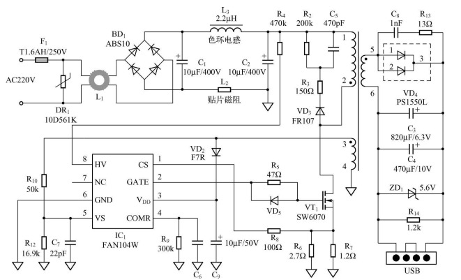 圖為USB手機充電器電路原理圖,采用Fairchild公司出品的一次繞組反饋(PSR(3))控制器FAN104W。 ![]() 變莊器上的一繞組線,通過這個繞組上的電壓、電流變化確定電路的工作情況,從而來調(diào)整電路的工作穩(wěn)定。一次繞組反饋(PSR)與傳統(tǒng)二次繞組反饋光耦和TL431的結構相比,節(jié)約了電路板上的空間,降低了成本。在省去了光耦和TL431等元器件之后,為了實現(xiàn)高精度的恒流/恒壓(CC/CV)控制特性,必然要采用新的技術來監(jiān)控負載、電源和溫度的實時變化及元器件的同批次容差,這就涉及一次繞組調(diào)節(jié)技術、變壓器容差補償、線纜補償和EMI優(yōu)化技術。 (1)高壓啟動 市電經(jīng)F1(延時保險絲)輸入,經(jīng)DR1(綠色壓敏電阻)過壓保護和共模扼流圈L1送給DB1進行全波整流。高壓電容C1、C2與電感L3構成π形濾波電路,貼片磁阻L2用于濾除差模干擾。直流母線通過電阻R4(推薦值為100kΩ)連接至FAN104的8腳(HV)。初始上電時,內(nèi)部高壓電流源開啟,為HV引腳提供輸入電流IHV,對電源端VDD外接電容C9充電。當VDD電壓達到IC開啟電壓VDD-ON時,內(nèi)部高壓電流源被禁用,阻止IHV流入HV引腳。 IC開啟后(在PWM輸出之前),C9是提供IC消耗電流的電能來源。因此,C9必須足夠大(推薦值為22μF),以便在輔助繞組輸出電壓之前阻止VDD降至IC關斷電壓VDD-OFF。正常工作時,由輔助繞組經(jīng)VD6、C9整流濾波給FAN104供電。 (2)FAN104W引腳功能 該高度集成的PWM控制器FAN104W具備多種功能,可增強低功率反激轉換器的性能。FAN104W專有的拓撲結構簡化了電池充電器應用中的電路設計。與常規(guī)設計或線性變壓器相比,這樣的充電器具有更低的成本、更加小型化,也更加輕便。FAN104W各引腳功能說明見表。 表FAN104W各引腳功能說明