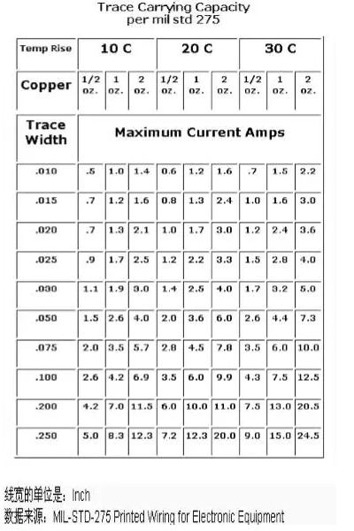 但很多人有一個誤區比如:假設在同等條件下,10mil的走線能承受1A,那么50mil的走線能承受多大電流?很多人都認為是5A。但其實不能這樣通過線寬倍數來計算載流能力,請看以下來自權威機構提供的數據供大家參考: