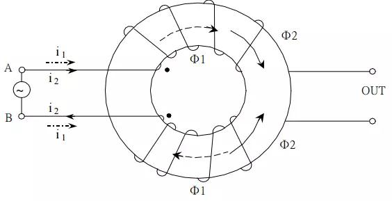 如圖所示,在同一磁環上繞上兩組方向相反的線圈,據右手螺旋管定則可知,當在輸入端A、B兩端加上極性相反,信號幅值相同的差模電壓時,有實線所示的電流i2,在磁芯中產生實線所示的磁通Φ2,只要保證兩繞組完全對稱,則磁芯中兩不同方向之磁通相互抵消。總磁通為零,線圈電感幾乎為零,對常模信號無阻抗作用。若在輸入端A、B兩端加上極性相同,幅值相等的共模信號時,有虛線所示的電流i1,在磁芯中產生虛線所示的磁通Φ1,則磁芯中磁通有相同的方向而互相加強,使每一線圈的電感值為單獨存在時的兩倍,而XL =ωL,因此,此一繞法的線圈對共模干擾有很強的抑制作用。