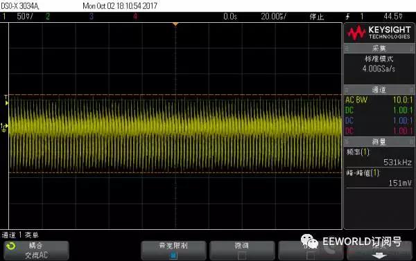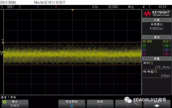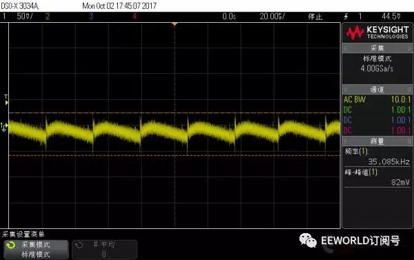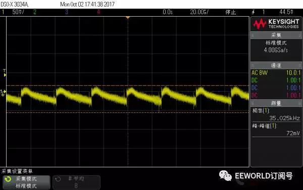 先說說測試之前的預期或者認識: Anker 的新款能賣這么貴,毫無疑問紋波比老款控制的好; 蘋果的充電器是目前較常用的,覺著能賣這么貴,質量自然是不錯的; 黑色的 Bigben,是在淘寶上買的,說是英國貨,但google到的資料很少,的幾條記錄都是指向國內的淘寶...這個充電頭質量還行,原來試過同時給ipad和充電寶充電,3.4A也是妥妥的!但是有“蜂鳴聲”:手機充滿了,電源輕載就有蜂鳴聲;聲音微弱,不過留意聽還是可以聽到的;甚至,空載的時候從插座拔下來,把它放到耳邊,能清楚的聽到蜂鳴聲過一段時間才消失;本以為是個別現象,后來又買了一個還是同樣的問題!??!這個“蜂鳴聲”本不大,但是一旦聽到就沒法忽略,遂閑置很少再用 堅果pro的18W充電器,試過給堅果手機充電,快充支持的很好,但是帶兩個充電頭不方便,也很少用 “終結者”移動電源是我親見過較強大的移動電源,QC3.0輸入、輸出,甚至支持一些筆記本適配器直接充電,也可以給ipad 2.4A充電,其他的電壓、電流、溫度、氣壓計、電子羅盤...應有盡有!這個是我的出差必備 廢話不再多說,下面開始上圖 測試條件 負載:1A 測試時僅采用1個4.7Ω功率電阻,2A 測試時在前者基礎上并聯 4Ω 電阻 (考慮導線壓降,實際電流分別為大于0.9A,和大于1.9A) 示波器:交流耦合,20us/div , 50mV/div, 20M 帶寬限制,1:10衰減探頭 下面正式開始測試 PS. 由于是負載端直接測量,測量結果可能沒法和正規測試相對比,在這里僅做個橫向對比 Anker 新款 充電器 1A 帶載波形