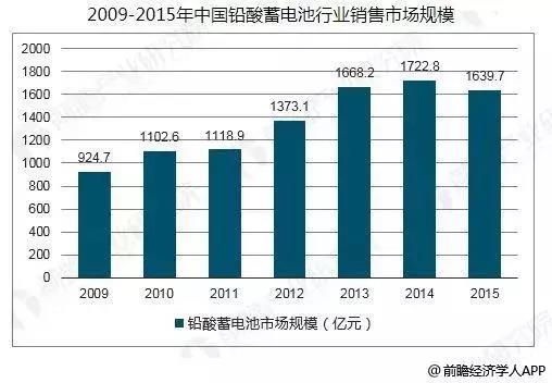 據前瞻產業研究院《中國鉛酸蓄電池行業市場前瞻與投資戰略規劃分析報告》數據顯示,隨著經濟的持續快速發展,汽車工業、通訊、電力、交通鐵路、計算機等基礎產業發展十分迅速,這些行業都處于一個高成長時期,對蓄電池的需求日益增長,大大促進了蓄電池行業的發展,2015年我國鉛酸電池行業銷售市場規模約1639.7億元。