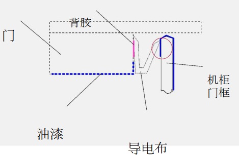 再看看機(jī)柜門框, 油漆保護(hù)位置同樣不夠, 門框與導(dǎo)電布接觸部位正好也被油漆所覆蓋(如圖中紅色圈所示)。因此在這種情況下導(dǎo)電布雖然貼了,但電磁屏蔽效果并不佳。