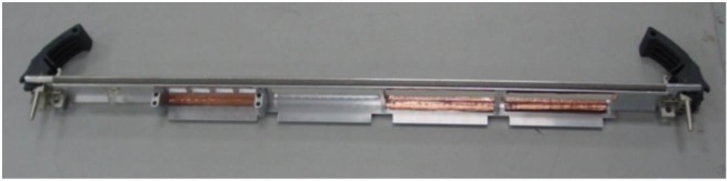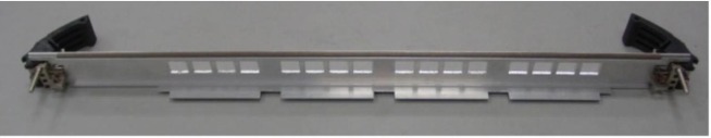 更改以后進行測試發(fā)現(xiàn)100MHz 處干擾下降了 18dB 左右,已經(jīng)能夠接近限值線附近。但是,測試還是不能通過。由于我們認為拉手條已經(jīng)處理的比較好了,因此,后續(xù)的對策工作在其他很多方面展開,包括更換單板上的電感, 電阻和改變單板在槽位上的配置情況等。 結果發(fā)現(xiàn)更改單板的槽位配置情況改善比較明顯,能在滿配置的情況下改善將近 10dB 的測試結果,其他沒有什么很好的辦法能使干擾再大大降低。 由于該問題急待解決,因此,我們做了很準備很充分,領取了一些必須的物料。首先將拉手條全部更換成新領的物料,包括方形槽的小扣板和壞的導電膠圈。仍然使用一直測試的單板進行測試,測試結果立即下降7dB 多一點, 100MHz 處干擾下降至 44.9dBμV/m,正好在裕量線(45dBμV/m)以下。另外, 還準備了一體化的拉手條,即不使用小拉手條和導電膠圈的方案,如圖: