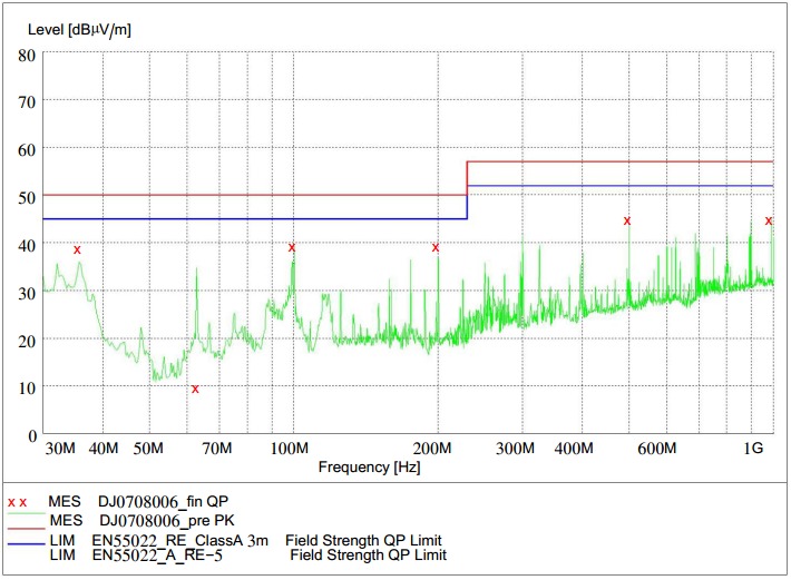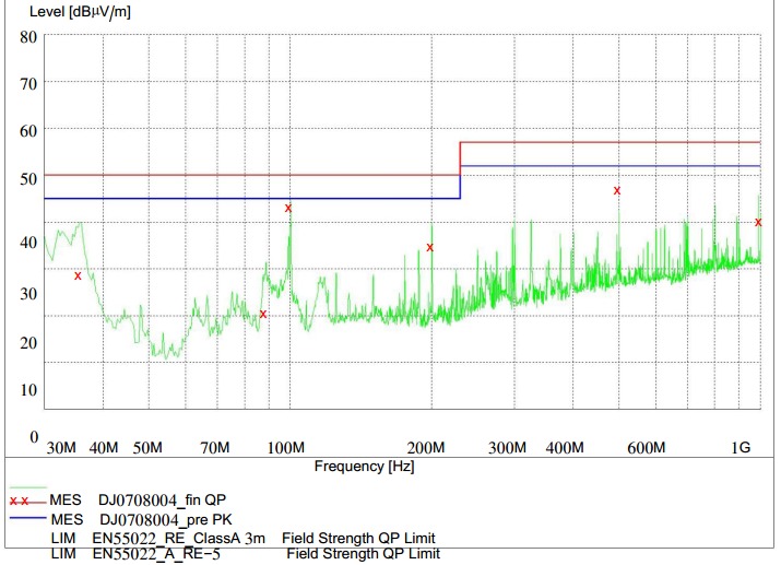 測試結果有下降了5dB,達到 39.9 dBμV/m。至此, XXX 產(chǎn)品的 EMC 問題已經(jīng)得到解決。 測試結果如下: