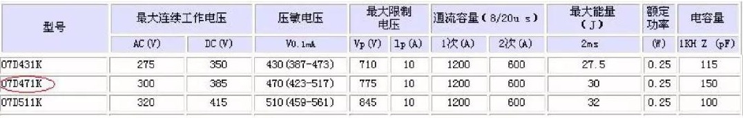 選取壓敏電阻的方法 結合前面所述,來看一下本電路中壓敏電阻的型號所對應的相關參數。