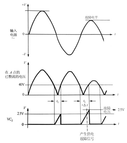 前述的系統對于持續低電壓故障的響應速度很慢,這些電路是依據峰值電壓以及平均電壓來實現報警的。另外報警電路中的濾波電容也將引起一個延時,濾波電容的取值要折中考慮。選擇較小的電容可防止在充電器保持時間與濾波電容時間常數之間產生矛盾,而選擇較大的電容可得到令人滿意的紋波電壓抑制。 在輸入充電器電壓完全失效之前肯定會在整流模塊的輸出端有所反映,因此通過直接檢測整流模塊的輸出端電壓便可以發現供電充電器失效是否正在發生。該電路可以對輸入電壓變化率dv/dt的減少做出反應,如果輸入電壓的峰值比正常值低,在工作的開始半個周期內就會做出反應。此系統能在低電壓逼近的狀態下發出更早的報警。 該電路可提前檢測到輸入電壓的變化率是否低于設定值,此值對應于合適的峰值交流電壓。如果在電壓過零后dv/d變低,即假設發生了故障,在該半周期結束之前將產生一個報警信號。這就提供了一種有用的額外幾毫秒的報警。 圖顯示的是模擬充電器持續低電壓故障的曲線,在該圖中正弦波輸入的第二個周期的電壓突然降低。