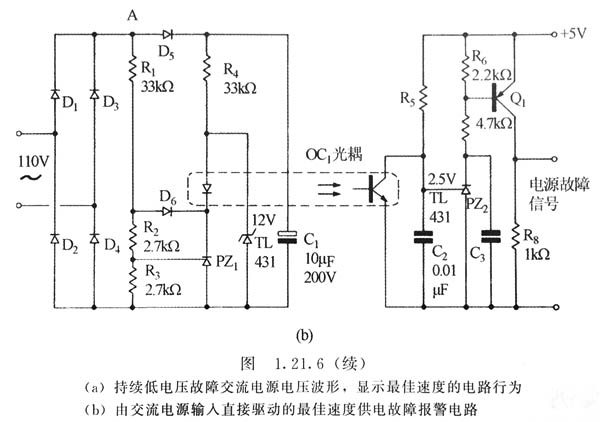 拿整流后的電壓波形與參考電壓進行比較,由于整流后的瞬變電壓超過參考電壓的持續時間△t,顯示供給的電壓變化增大。這個變化可以在半波周期全部完成前提示一種可能發生的故障。這種方法能夠盡可能早地給出充電器持續低電壓故障的警報信號。圖1。21。6b給出了一個合適的電路。 這個電路的工作原理如下。首先交流輸入電壓經過由D1~D4組成的橋式整流進行整流。在橋式整流的輸出端是一個由電阻R1、R2、R3組成的分壓網絡,該分壓網絡也是橋式整流電路的負載,該分壓網絡保證在A點有一個經過整流了的半周期電壓波形,如圖1。21。6a所示。這時A點半周期波形電壓就會通過R1、R2、R組成的分壓網絡送到比較器放大器PZ1的輸入端。當A點電壓波形在第二個半周期的下降部分經過50V時,對應PZ的控制端電壓也降低并經過2。5V,這時分壓調節器PZ1和光耦OC1將關斷。 就這樣在C2上形成了一個時序脈沖,A點電壓在指定時間內的下一個半周期內的上升沿再一次經過50V時引起PZ1和Q1導通,就會輸出供電故障信號。 這個時序脈沖由C1、R以及副邊電壓(在本例中是5V)來決定。在每個半波周期內,OC1關斷,C2充電,充電時間是從A點電壓下降且穿過50V的下降時刻開始直到A點電壓再一次上升并穿過50V的時刻為止的這段時間。由圖1。21。6a所示可知,如果OC的關斷時間過長,那么在C2上的充電斜波電壓將超過2。5V,這時PZ2導通,跟著Q1也導通,輸出一個供電故障信號。光電耦合器件用來隔離檢測電路與輸出故障信號電路。 在這個電路中,臨界工作電壓得到很好的定義。臨界工作電壓可以調整,當充電器電壓下降到所要求提供充電器保持時間的臨界工作電壓值時,針對充電器電壓這種變化將產生故障信號。該電路的響應速度相當的快,它能夠在1ms8ms內產生一個持續低電壓供電故障的報警信號,具體響應時間取決于在一個周期中發生故障的位置。 想了解關于更多電源適配器廠家排名前十的東莞玖琪,歡迎登錄:http://m.liantaifs.com.cn/