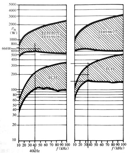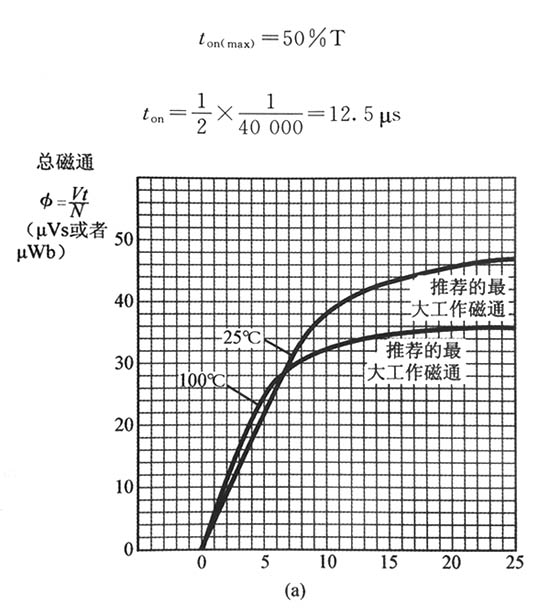 圖表示對于在正激和推挽應用場合使用EE55-5521和其他磁心時的較佳變壓器設計中制造商推薦的峰值和較佳磁通密度。在圖(在40kHx),制造商推薦的峰值磁通密度是100mT,這個值接近于較佳值,本例中使用這個較高的值以減少繞組匝數。
