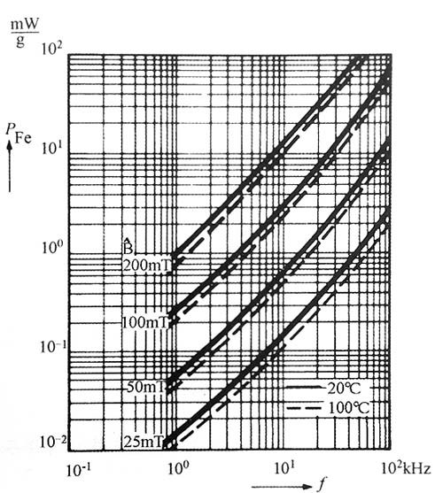 圖每克A16鐵氧體的磁心損耗是頻率的函數,以峰值磁通密度為參數注:圖中曲線畫的是峰值磁通密度B,磁通密度變化范圍△B是2×B
