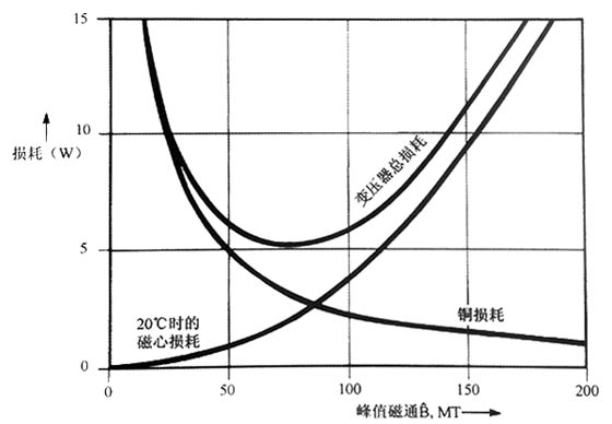 通常假設,較小的損耗(較大效率)出現在銅損耗和磁心損耗相等的情況,這是選擇工作磁通密度時常用的設計目標。