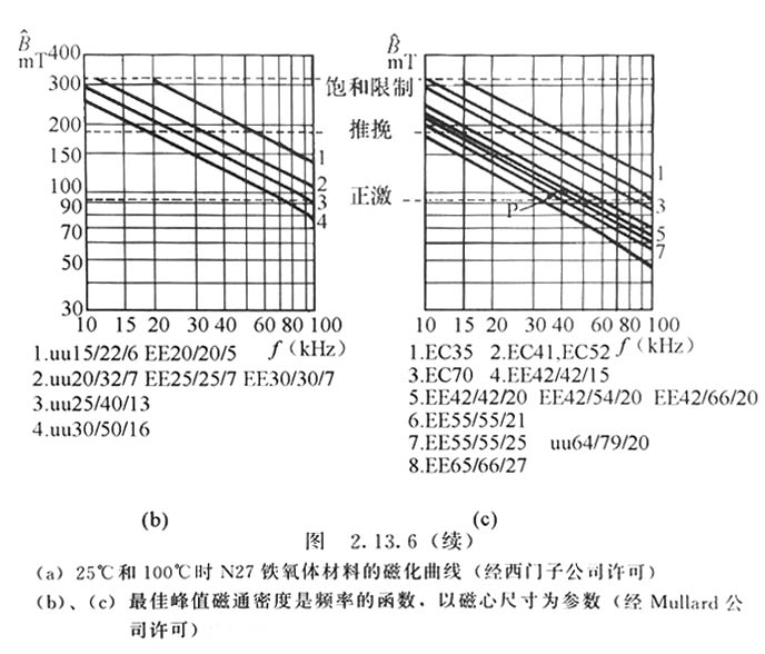 應該注意圖2。13。4表示的是峰值磁通密度B,但假設損耗是對峰峰磁通密度偏移△B(2×B)而言的。對于較佳效率,選擇的B是100mT。因此,本例中峰峰變化(磁通偏移擺幅)△B=2×B或=200mT