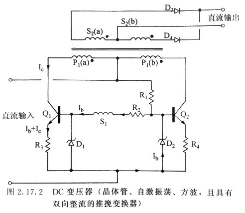 DC-DC變壓器舉例 在本例中,用推挽變換器來說明其工作原理。圖2。17。2表示了一個典型的自激振蕩方波變換器。這種變換器的特點是以全導通角工作,即不使用脈寬調制,每個晶體管的導通占整個周期的50%。同時在這種簡單結構中,變換器沒有調節作用,直流輸出電壓會隨輸入而變化。
