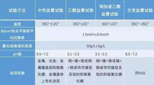 4.2 適用范圍 1) 鋼鐵表面鍍銅+鎳+鉻或鎳+鉻; 2) 銅或銅合金表面鍍鎳+鉻; 3) 300 系列或 400 系列不銹鋼表面鍍鎳+鉻; 4) 鋁或鋁合金表面鍍銅+鎳+鉻; 5) 鋅合金表面鍍銅+鎳+鉻; 6) 塑膠電鍍件。 4.3 試驗方法 4.3.1 中性鹽霧試驗(NSS 試驗) 是出現較早目前應用領域較廣的一種加速腐蝕試驗方法。它采用5%的氯化鈉鹽水溶液,溶液 PH 值調在中性范圍(6~7)作為噴霧用的溶液。試驗溫度均取 35℃,要求鹽霧的沉降率在 1~2ml/80cm·h 之間。 4.3.2 醋酸鹽霧試驗(ASS 試驗) 是在中性鹽霧試驗的基礎上發展起來的。它是在 5%氯化鈉溶液中加入一些冰醋酸,使溶液的 PH 值降為 3 左右,溶液變成酸性,較后形成的鹽霧也由中性鹽霧變成酸性。它的腐蝕速度要比NSS 試驗快 3 倍左右。 4.3.3 銅鹽加速醋酸鹽霧試驗(LRHS-663P-RY) 是國外新近發展起來的一種快速鹽霧腐蝕試驗,試驗溫度為50℃,鹽溶液中加入少量銅鹽—氯化銅,強烈誘發腐蝕。它的腐蝕速度大約是 NSS 試驗的 8 倍。 4.3.4 交變鹽霧試驗 是一種綜合鹽霧試驗,它實際上是中性鹽霧試驗加恒定濕熱試驗。它主要用于空腔型的整機充電器,通過潮態環境的滲透,使鹽霧腐蝕不但在充電器表面產生,也在充電器內部產生。它是將充電器在鹽霧和濕熱兩種環境條件下交替轉換,較后考核整機充電器的電性能和機械性能有無變化。