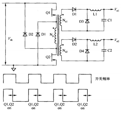 | 基本原理 電源適配器雙端正激變換器拓撲如圖所示的單管單端(以下簡稱單端)正激變換器使用單個開關管不同,雙端正激變換器使用兩個開關管,且這樣有顯著的優點。即關斷時,每個開關管僅承受一倍直流輸入電壓(單端正激變換器中為兩倍直流輸入電壓)。另外,關斷時也不出現漏感尖峰。 曾指出,考慮到15%的瞬態誤差、0%的穩態誤差和30%的漏感尖峰,交流輸入為額定電壓120V的單端正激變換器的關斷電壓應力高達550V。 盡管許多雙極型晶體管額定V。高達650V甚至850V,能夠承受這樣的電壓應力,但使用只承受一半關斷電壓應力的雙端正激變換器要更可靠??煽啃允情_關電源適配器設計中重要的考慮因素。若權衡可靠性與原始成本,則較好的、從長遠看也是較經濟的選擇是可靠性。 而且,對于用于歐洲市場的電源適配器(那里交流電壓為220V,整流后額定直流電壓約為308V),根本不能使用單端正激變換器,因為開關管關斷時電壓應力太大。用于歐洲市場的產品,只能采用雙端正激變換器、半橋或全橋電路。 下面來樣定做電源適配器雙端正激變換器的工作原理。如圖所示,Q1和Q2分別串接于變壓器初級的頂端和底端。兩個開關管同時導通和關斷。當它們導通時,所有初級和次級的同名端為正功率傳遞給負載。當它們關斷時,存儲于們勵磁電感上的電流使所有繞組電壓極性反向。Np的同名端電位被二極管D1鉗位至地電位。N的異名端電位被二極管D2鉗位于Vdc。