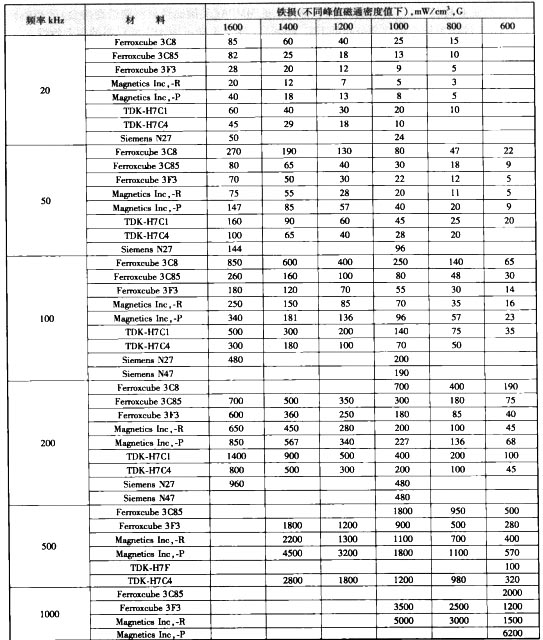 | 大家希望了解關(guān)于電源適配器設(shè)計的要求來選擇較合適的拓撲,可以在前面文章查看。通常設(shè)計電源適配器選擇電路拓撲時較需要考慮的是高網(wǎng)壓時功率開關(guān)管承受的關(guān)斷電壓應力較小,而輸出較大功率時過開關(guān)管的峰值電流較小。其他需要考慮的還有減少元器件數(shù)量、電源適配器成本以及整機體積。另外,如何減小射頻干擾也是在選擇拓撲和開關(guān)頻率時需要考慮的一個因素。 電源適配器電路拓撲選定以后,就要確定電路的工作頻率和電源適配器變壓器磁心尺寸,確保在電源適配器變壓器體積較小的情況下獲得所需要的較大輸出功率。要確定頻率和電源適配器變壓器磁心尺寸,首先要知道輸出功率和電源適配器變壓器各種參數(shù)之間的關(guān)系,如電源適配器變壓器體積、磁心窗口面積、骨架繞線面積、峰值磁通密度、工作頻率以及線圈電流密度等。下面的章節(jié)將對較常用的幾種電路拓撲的這些關(guān)系進行推導,并給出計算公式。 上面所提到的這些關(guān)系可以寫成公式的形式,根據(jù)這些公式可以選擇電源適配器變壓器磁心和工作頓率。一種方法是首先估算出所需磁心的大小和工作頻率,然后根據(jù)所選磁心、頻率以及相關(guān)參數(shù)計算出近似功率。如果這個功率不符合要求,就必須更改先前的假設(shè),重新設(shè)定電源適配器變壓器尺寸和工作頻率,重復以上過程。由于這些參數(shù)彼此相關(guān),所以必須經(jīng)過大量計算才能得到滿足要求的電源適配器變壓器尺寸和工作頻率。 另外一種更好的方法就是將公式轉(zhuǎn)化為圖表。圖表中縱坐標參量為工作頻率(每&kHz一格),橫坐標參量為不同廠家生產(chǎn)的磁心參數(shù),根據(jù)公式計算,縱軸與橫軸的交點就是在這些參數(shù)下的輸出功率。 沿著橫軸方向,輸出功率不斷增加。這樣由圖表就能很容易的選定工作頻率。只要沿著該頻率所在行向右查找,找到的第一個滿足功率要求的磁心即為所求。或者若滿足尺寸要求的磁心已經(jīng)選定,那么只要沿著該磁心所在的列向上查找,第一個滿足輸出功率要求的頻率就是所需要的頻率。 目前較常用的幾家電源適配器廠商生產(chǎn)的不同磁心材料的磁心損耗隨頻率和峰值磁通密度變化的特性,討論了現(xiàn)有的鐵氧體磁心的幾何結(jié)構(gòu)以及各自的應用場合。也提供了鐵損和銅損的計算方法,并對產(chǎn)生銅損的主要因素一鄰近效應進行了闡述。較后還論證了電源適配器變壓器溫升與磁心損耗和銅損的關(guān)系。 品字尾電源適配器變壓器磁心材料與幾何結(jié)構(gòu)、峰值磁通密度的選擇 幾種常用鐵氧體材料的磁心損耗與頻率和磁通密度的關(guān)系 大多數(shù)開關(guān)電源適配器的變壓器都采用鐵氧體磁心。鐵氧體是一種具有晶體結(jié)構(gòu)的陶瓷性鐵磁材料,一般由氧化鐵和錳或鋅氧化物混合構(gòu)成。因為它有很高的電阻率,所以鐵氧體的渦流損耗可以忽略。有些鐵氧體材料的磁心損耗主要來自磁滯損耗,如果磁滯損耗足夠小,則這種材料可以用在1MHz以上開關(guān)頻率的場合。目前市面上常用的鐵氧體磁心主要來自幾大廠家,如美國的 Ferroxcube- Philips、 Magnetics Inc。、 Ceramie Magnetics Inc。、 Ferrite International、Fairrite,以及其他國家的生產(chǎn)廠家如TDK、 sIemens、 Thomson-CSF、 Tokin等。 每個廠家都生產(chǎn)了一系列不同材料的磁心,采用不同的生產(chǎn)工藝可以得到不同優(yōu)點的產(chǎn)品。有的磁心材料可以使工作在高頻(>100kH)時的磁心損耗較小,有的可以使在高溫下(如90°C)磁心損耗較小,還有的可以使在常用的高頻和峰值磁通密度條件下的磁心損耗較小。但是,大多數(shù)廠家適用于功率電源適配器變壓器的鐵氧體的直流磁滯回線都是相似的。當溫度為100°C時,它們都在3000G到3200G的范圍內(nèi)達到10%的飽和度,矯頑力在0.10~0.150e之間,剩余磁通密度約為900~1200G。 選擇磁心材料的主要參考因素為磁心損耗(單位一般為mW/cm3)隨頻率和峰值磁密變化的曲線。以 Ferroxcube-Phip生產(chǎn)的3B3型磁心為例,圖7。1給出了其磁心損耗曲線和直流磁化曲線。表列出了一些常用材料的磁心損耗值。 盡管沒有特別說明,表中這些由磁心廠家提供的數(shù)據(jù)一般都是針對雙極性磁路即磁通變化工作在磁滯回線一、三象限的電路(如推挽、半橋和全橋)而言的,而正激變換器和反激變換器僅工作在第一象限。 由于鐵氧體的磁心損耗僅為磁滯損耗,而磁滯損耗又與磁滯回線所包含的面積成正比,因此可以想象,如果電路的磁場是單極性的,磁滯回線面積僅為雙極性磁場的一半,那么在相同的峰值磁通密度下,磁心損耗僅為雙極性電路的一半。 關(guān)于這一點,生產(chǎn)商之間還存在不少的爭議。有的廠家認為在同樣的峰值磁通密度下,單極性電路的磁心損耗只有雙極性電路的1/4,他們認為單極性電路的磁通密度從零變化到較大磁通密度B_時,相當于雙極性電路的磁通密度從較小值(-B2)變化到較大值(B/2)。而雙極性電路中磁心損耗與峰值磁通密度變化的平方成正比,那么有著相同峰值磁通密度變化的單極性電路的磁心損耗應為雙極性電路的1/4。 TDK提供的曲線顯示,一個單極性電路磁通密度從零變化到B_時的磁心損耗與雙極性電路的磁通密度從一B到+B=時的磁心損耗呈