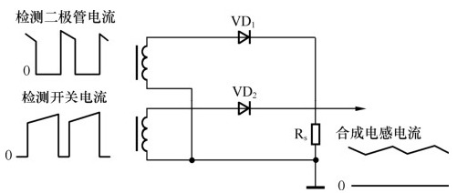 解決這個問題的方法是用兩個電流互感器分別測量開關電流和二極管電流,如圖3-4所示的電感電流是這兩個電流的合成,這樣每個電流互感器就有足夠的時間來復位了。但要注意這兩個電流互感器的匝比應一樣,以確保檢測電阻Rs上的電流對稱。