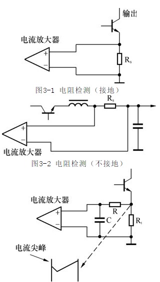 電阻檢測有兩種,如圖3-1和圖3-2所示。當采用圖3-1所示方法直接檢測開關管的電流時,還必須在檢測電阻Rs旁并聯一個小RC濾波電路,如圖3-3所示。因為當開關管斷開時集電極電容放電,在電流檢測電阻上產生瞬態電流尖峰,此尖峰的脈寬和幅值足以使電流放大器鎖定,從而使PWM電路出錯。