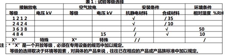 試驗等級及其選擇: 試驗電平以較切合實際的安裝環(huán)境和條件來選擇,表 1 提供了一個指導原則。表1 同時也給出了靜電放電試驗等級的優(yōu)先選擇范圍,試驗應滿足該表所列的較低等級。表 1:試驗等級選擇