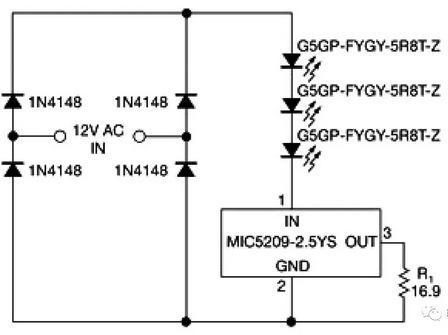 該電路采用價格合理的150毫安暖白色發光二極管、低成本的整流二極管、2.5V MIC5209-2.5-YS穩壓器。該穩壓器必須至少提供所需的發光二極管電流,并且處理峰值輸入電壓,減小四個整流二極管兩端和發光二極管串兩端的壓降。