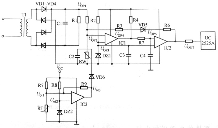 圖2-65高性能保持電路圖 ①鑒流線圈能較大程度地感應(yīng)到主振蕩管電流的變化情況 ②T1鑒流線圈后級(jí)接法基本上是通用型PWM整流?濾波線路?相對(duì)于一般鑒別電源適配器總電流的方法,它的鑒流輸出功率大,易于后級(jí)的再處理,鑒流輸出的電壓Vom隨電源輸入電壓變化較小,其值主要取決于振蕩管上的電流脈動(dòng)波形的積分?這樣,就使輸入電壓的低端與高端能得到基本相同的過流保護(hù)特性。 RW為人工設(shè)定過流保護(hù)點(diǎn)的調(diào)節(jié)電位器;R3?R6?R9為正反饋電阻,用以設(shè)定保護(hù)點(diǎn)的閾值電壓;Rr為正溫度系數(shù)的熱敏電阻?電源適配器正常工作時(shí),Uom<<Uom,運(yùn)算放大器IC1的輸出電壓Uo等于其截止電壓,約為0.2V,運(yùn)算放大器IC2的輸入端電壓Uoe<<Uom,Uour等于其截止電壓,約為0.2V?通過電阻將其接于UC2525A的⑩腳,此電平足以保證電路正常工作?一且輸出出現(xiàn)過載或短路現(xiàn)象,Uom>Uom,運(yùn)算放大器IC1的輸出電壓Uom變高,等于運(yùn)放較大輸出電壓幅度,約為Vc-2V?此時(shí),電源馬上給電容C4充電,使運(yùn)算放大器IC2的輸入端電壓Uon>>Uom,Uour變高,此電平足以保證電路UC2525A完全關(guān)閉,使電源進(jìn)入停止工作期?在此期間,鑒流輸出電壓Uo為零,Uom<<Uom,運(yùn)算放大器IC1的輸出 電壓Uom又將等于其截止電壓,約為0.2V?此時(shí),因?yàn)殡娙軨4上的電壓Uom不能突變,必須通過電阻R7放電,R7?C4取值較大,通過改變R7或C4的值來調(diào)節(jié)停止工作期的時(shí)間?只有當(dāng)Uoms放電到Uo<Uom時(shí),Uour才變低,電源重新進(jìn)入正常工作狀態(tài)?如果過流狀態(tài)依然存在的話,電源又將進(jìn)入停止工作期?如此周而復(fù)始?在保護(hù)期間,UC2525A推動(dòng)級(jí)上的工作波形如圖2-66所示? 調(diào)節(jié)R7?C4值,使T2>>T1,保證電源適配器在真正意義上進(jìn)入睡眠狀態(tài)?從電路分析可以看出,因?yàn)橛辛薘7?VD5?C4組成的充?放電回路,通過二極管VD5充電快而放電慢,加之R3?R7正反饋電阻設(shè)定閾值保證Uout的輸出狀態(tài)只有兩種,即高電平或低電平?如果沒有R7?VD5?C4組成的充?放電回路,則T2約等于T1,對(duì) UC2525A的⑩腳電壓來說將出現(xiàn)0.6~0.8V頻繁變化,將使電源處于頻繁的啟動(dòng)與關(guān)閉狀態(tài),對(duì)振蕩管極為不利,也較容易損壞功率管? 借助上述電路,可以很容易地構(gòu)成輸入過/欠壓保護(hù)電路?輸出過/欠壓保護(hù)電路以及過熱保護(hù)電路?在此,僅以附加過熱保護(hù)為例,說明如下?如圖2-65所示,過熱保護(hù)電路由IC3及其周邊元件組成?當(dāng)電源適配器的溫度沒有超過設(shè)定溫度時(shí),Um1<U?2,運(yùn)放IC3的輸出電壓U?為低電平?由于有二極管VD6的存在,此時(shí)IC3的輸出電壓Uo不會(huì)影響到UoP?也就是說在過熱保護(hù)電路未起作用時(shí),它不會(huì)影響到上述的過流保護(hù)電路的性能?當(dāng)電源適配器溫度降低到超溫保護(hù)點(diǎn)以下時(shí),電源才能重新進(jìn)入正常工作狀態(tài)?依此類推,可以構(gòu)成其他輸入輸出過/欠壓保護(hù)電路?在此,不再一一贅述? 根據(jù)上述設(shè)計(jì)原則,同樣可以類推出諸如F494?F3825A?F384X系列?F3524等幾乎所有PWM型芯片所組成的各種電路形式?