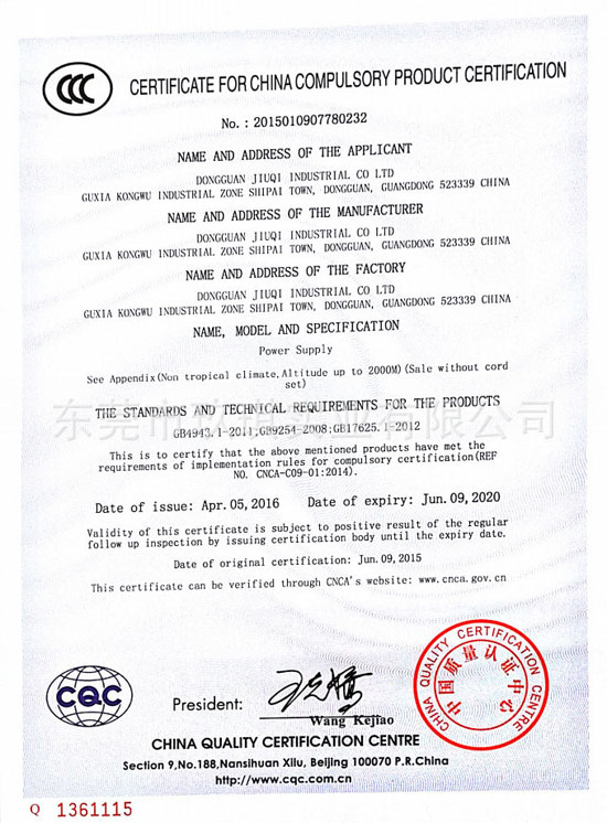 網站首頁 » 產品展示 » 產品認證 » 13.5W證書 » CCC安規證書-13.5W系列電源適配器